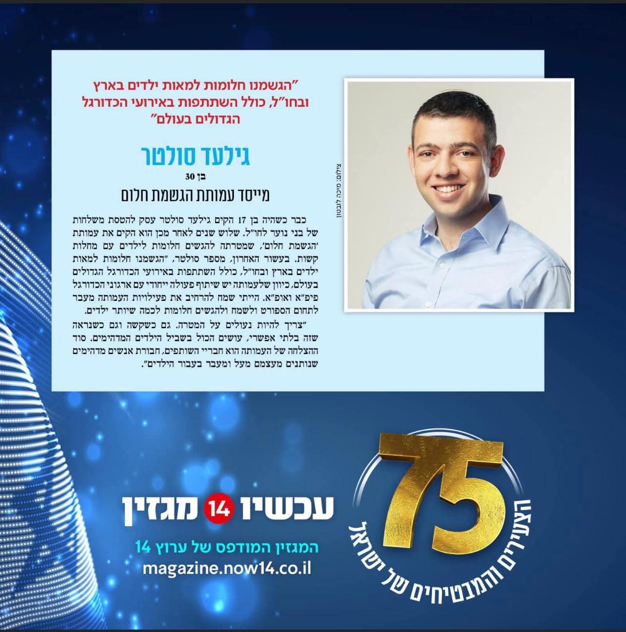גילעד סולטר, מייסד עמותת "הגשמת חלום", נבחר לכבוד יום העצמאות ה-75 לאחד הצעירים המבטיחים בישראל. 🇮🇱